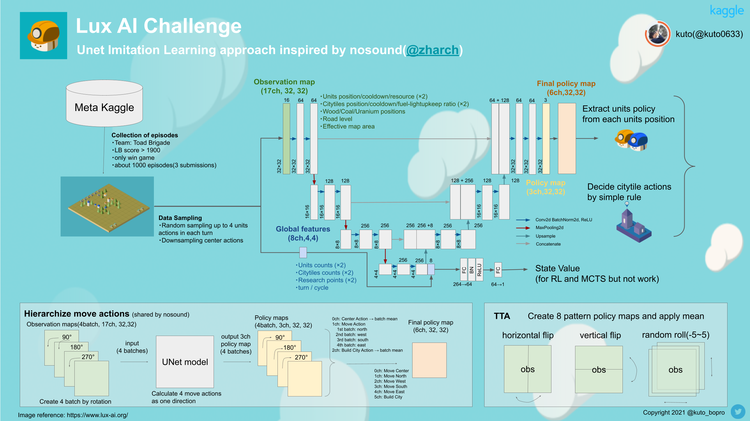 この手法は行動が比較的シンプルに決定できるCItytileの方はルールベースで決定し、Unitの方はゲームの状態と対象Unitの状態を19chのマップとして特徴量化し、特に重要な行動である4方向のMove行動とBuild City行動に絞って模倣学習を行うというものでした。この手法は非常によく働いており公開当初は銀圏の上位に食い込むほどのものでした。そこで私もこのモデルをベースに模倣学習を実施していました。